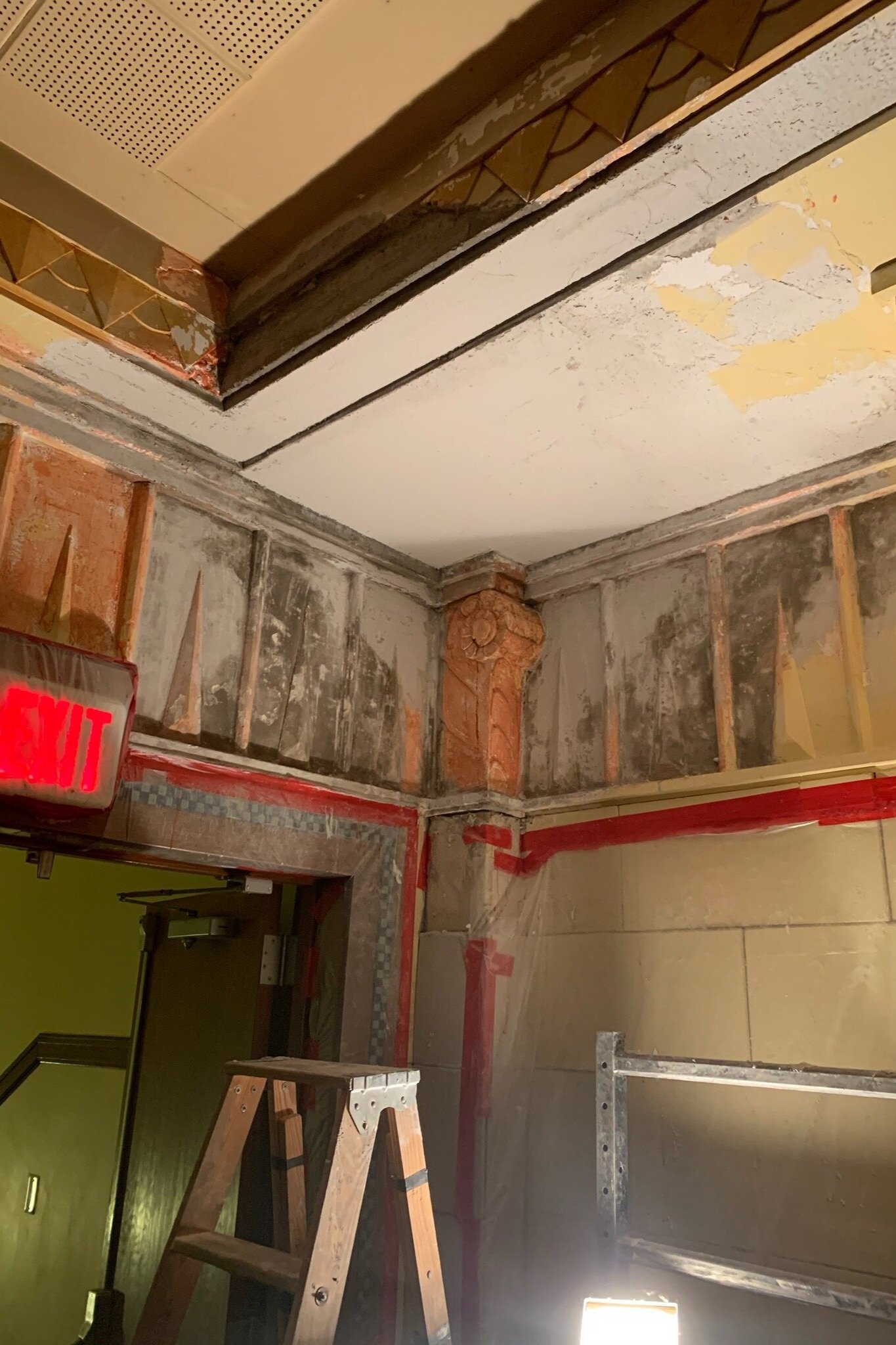 Prep work prior to repair the plaster cornice, ceilings and walls.